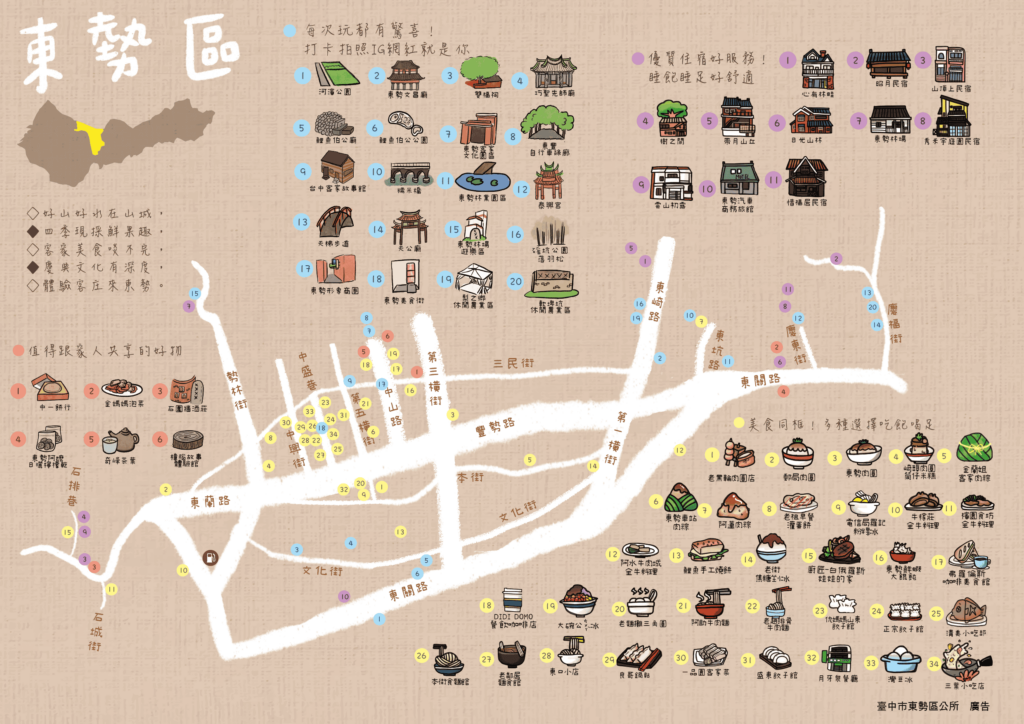邀請全台特色文創小物,展現工藝產業的創意與活力,品嚐東勢各式特色客家經典菜餚、糕餅、咖啡,來東勢好吃好玩一次滿足。